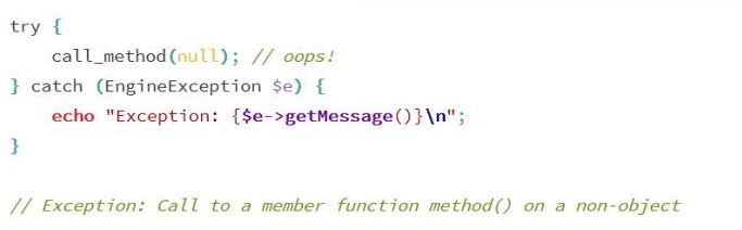 \EngineException 对象没有继承\Exception,这保证了代码的向后兼容和在错误处理时的两种不同类型的异常处理:传统的和新的引擎的异常处理.