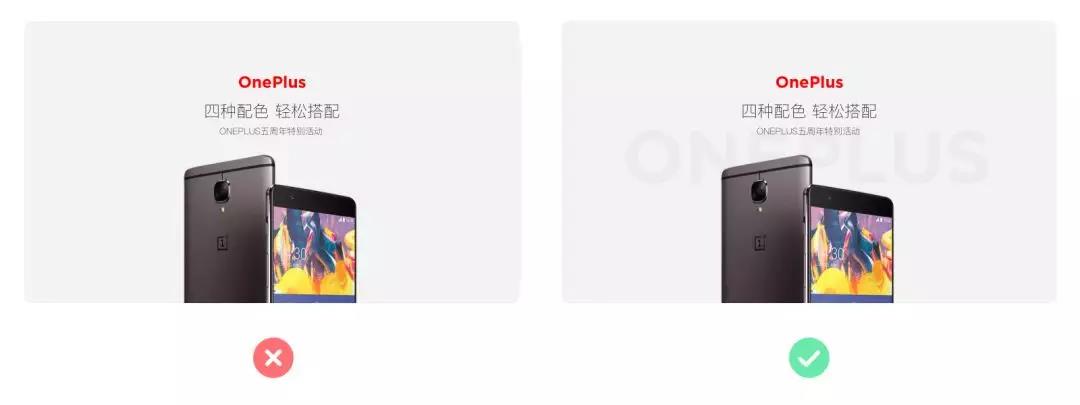 在平面上营造空间感,不外乎在于近大远小与景深模糊。营造空间感也是为了突显主体,制造视觉重点,吸引用户的注意力。如左图中,两个相同形状大小的产品直接叠加在一起,是没有空间感可言的,左字右图的平衡被完全打破了。在右图中,我们把置于后面的产品进行调小跟模糊,让视觉的重点落在前面,而后面的产品就会被潜移默化的当成背景的一部分,从而形成画面左字右图的内容平衡。